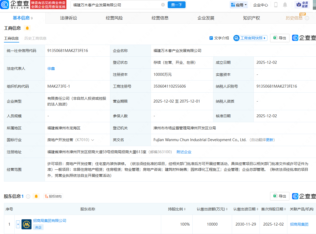 近日,福建万木春产业发展有限公司成立,法定代表人为徐鑫,注册资本为1亿元,经营范围包含:房地产开发经营;住宅室内装饰装修;住房租赁;物业管理;房地产咨询;建筑材料销售等。企查查股权穿透显示万银鼎信,该公司由招商局集团有限公司全资持股。