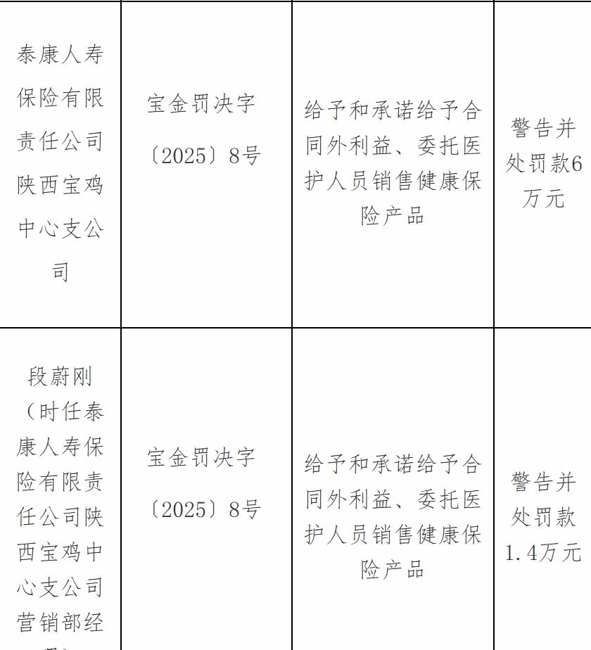 12月10日星速优配平台,国家金融监督管理总局宝鸡监管分局行政处罚信息公示表显示,泰康人寿保险有限责任公司陕西宝鸡中心支公司因给予和承诺给予合同外利益、委托医护人员销售健康保险产品被警告并处罚款6万元;责任人段某刚被警告并处罚款1.4万元。